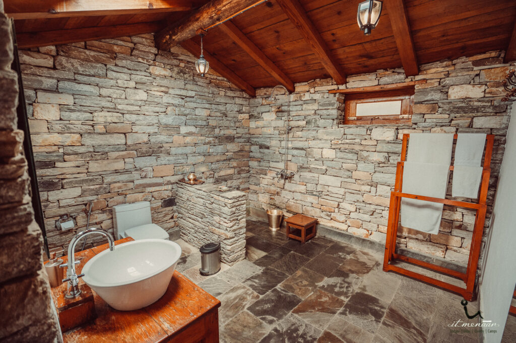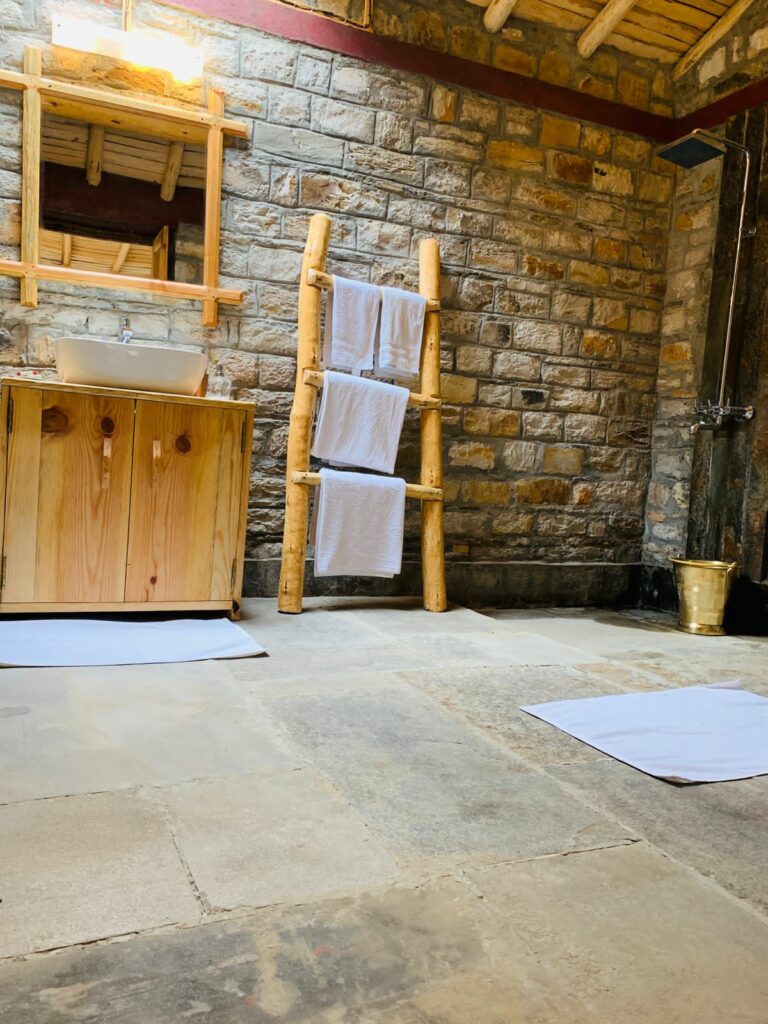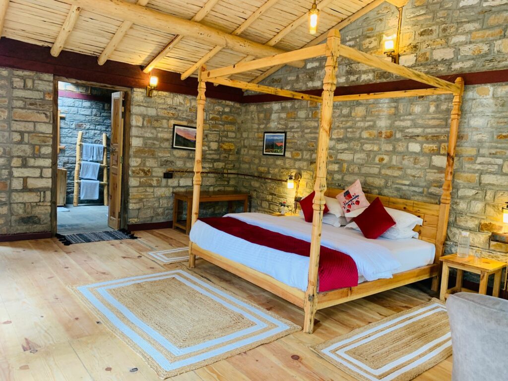 This two level cottage with a splendid valley and mountains views, offers a double bed and bathroom on the upper level. The lower level has a sitting area. There is a private open sitting area outside the cottage with splendid valley and Himalayan views.